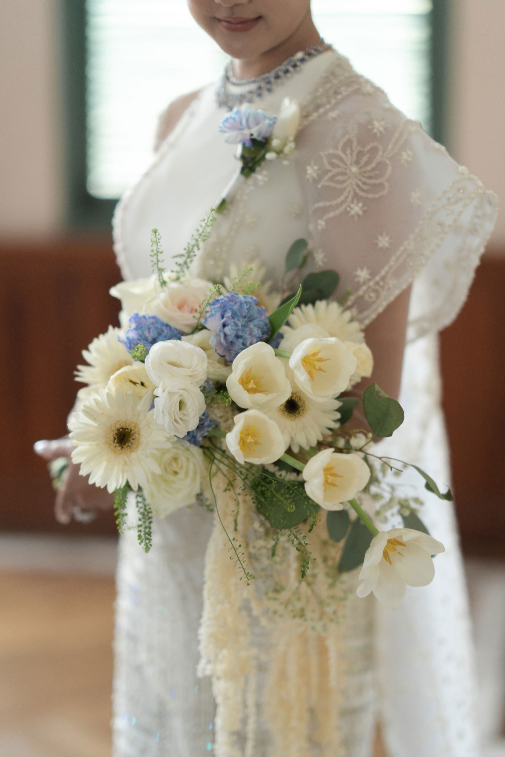 Because in Myanmar, before you get married, you need to check the dates and stuff like that with astrologers. My astrologer said we cannot use any yellow tone. I have to omit that yellow tone and then use blue instead.
