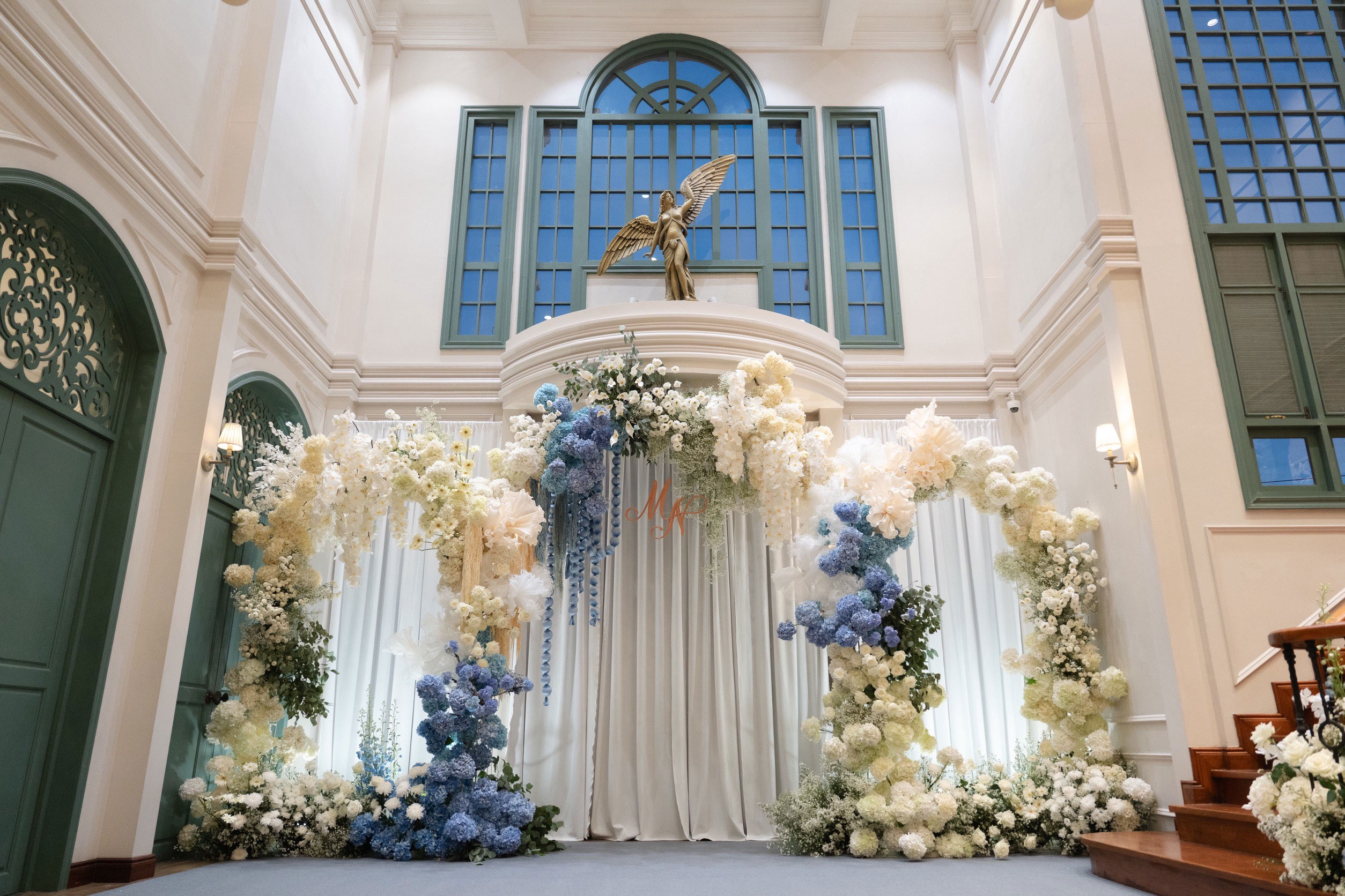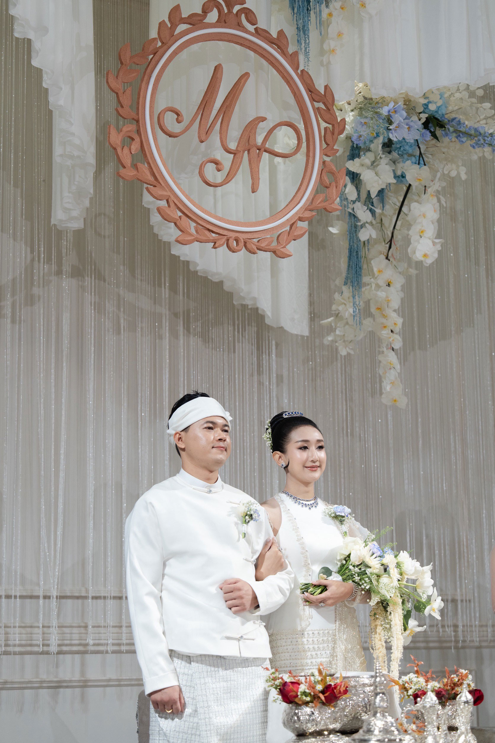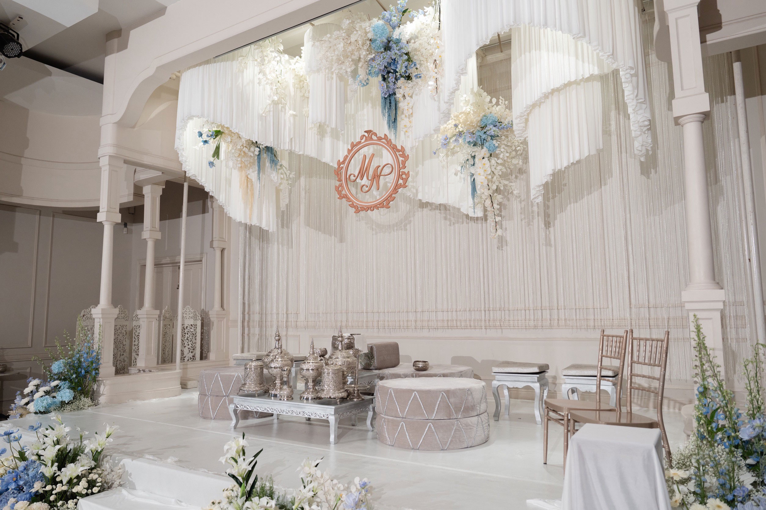 My favourite colour is blue. The backdrop is very beautiful. The stage is also very beautiful. We were worried that we might not have space for flowers. That’s why I asked p’Kaew not to put any flowers.